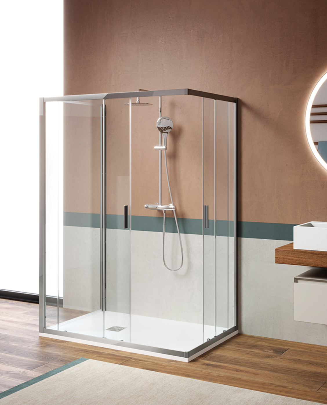 I profili in alluminio di alta qualità completano la struttura, garantendo robustezza, resistenza alla corrosione e un design minimale, elegante e facilmente integrabile in ogni tipo di arredamento bagno.