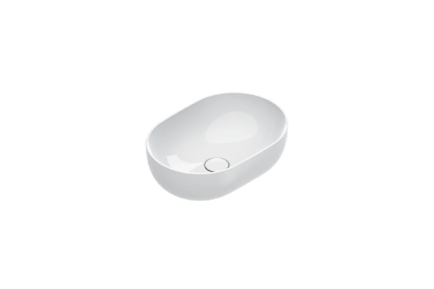 Lavabo ovale in ceramica senza troppopieno, progettato per installazione ad appoggio. La superficie è trattata con smalto antibatterico Cataglaze+ per garantire igiene, facilità di pulizia e durata nel tempo. Dimensioni compatte ideali per bagni piccoli o medi.