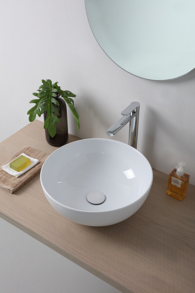 Il lavabo Sfera da appoggio Ø40 cm della collezione Ciotole unisce design rotondo e armonioso a funzionalità, donando equilibrio, stile e leggerezza ai bagni moderni. Perfetto anche per spazi compatti, è un elemento centrale di grande impatto estetico.